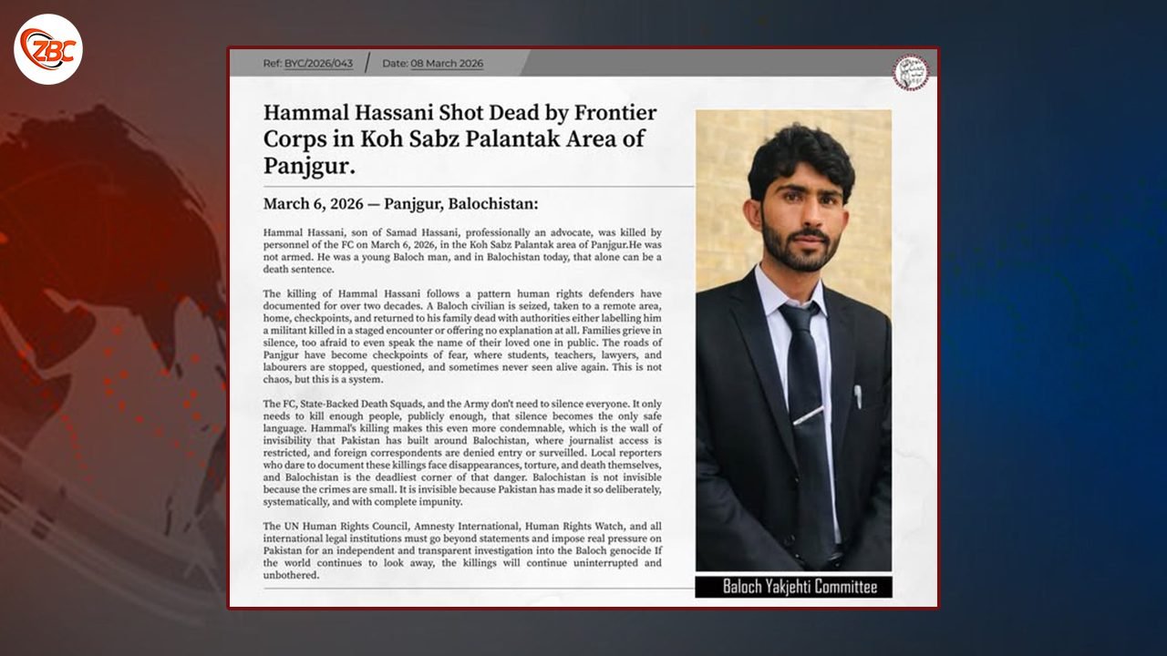 بلوچ یکجھتی کمیٹی ءَ وتی درشانے ءَ گوشتگ کہ ھمل ھسنی ء سمد ھسنی وکیلے، 6 مارچ 2026 ءَ پَنجگُور ءِ سبز کوہ، پلنتک ءَ پاکستانی پوج ءَ تیرگواری کرتگ ءُ کشتگ۔ آ بے میاریں مردمے ءُ آئی ءَ سلاہ گوں نہ بوتگ۔آ یک بلوچ ورنایے ءُ بلوچستان ءَ بلوچ بوگ ھم میارے جوڑ بوتگ۔