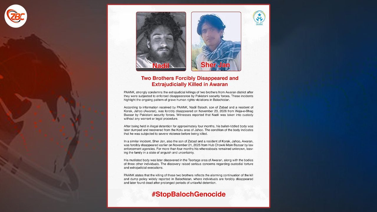 پانک ءَ گوشتگ کہ ھمے وڑ ءَ شیرجان ء زباد آواران ءِ ھند جاؤ، کورک ءِ جاہ منند اِنت، 21 نومبر 2025 ءَ چہ ھب چوکی ءِ بازار ءَ ریاستی ادارھاں زور بیگواہ کرتگ۔داں چار ماہ ءَ آئی ءِ ھچ وڑیں ھال نہ بوتگ، چہ ایشی ءَ کھول سکا جنجال بوتگ۔ پد ءَ آئی ءِ لاش چہ آواران ءِ ھند تیرتیج ءَ گوں دگہ سے مردمانی ھواری ءَ دزکپتگ۔