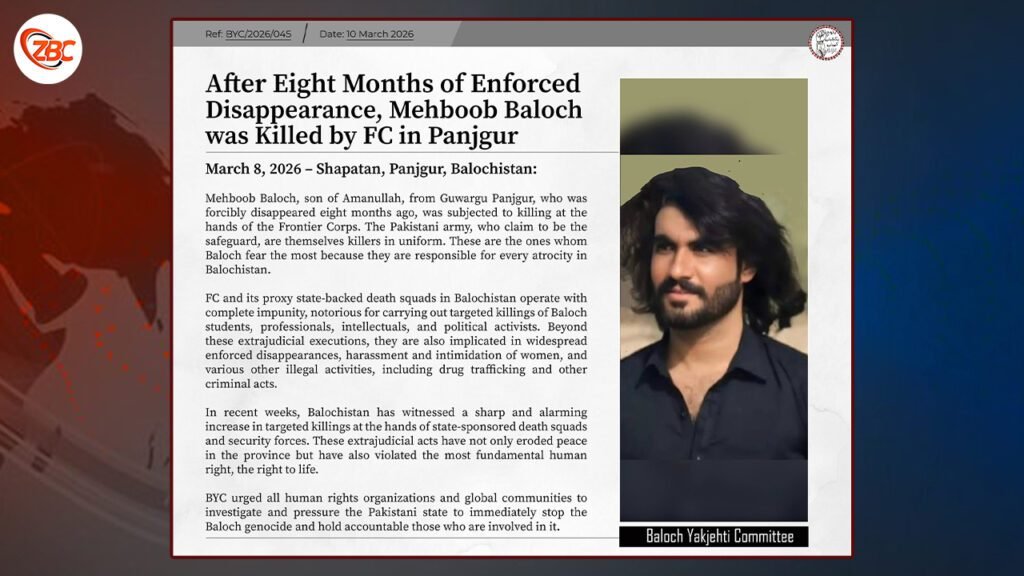 کھول ءِ گوشگ اِنت کہ مھراج بلوچ ءُ دُرا بلوچ کیچ ءِ ھند بسول کھن ءِ جاہ منند اَنت ءُ دوئیں نودربر اَنت۔ پاکستانی پوج ءَ 4 مارچ 2026 ءَ آوار جتگ ءُ بیگواہ کرتگ اَنت۔ ما گریبیں مردم ایں مئے زھگ گوں ھچ وڑیں درکانودی کاراں ھوار نہ بوتگ اَنت۔