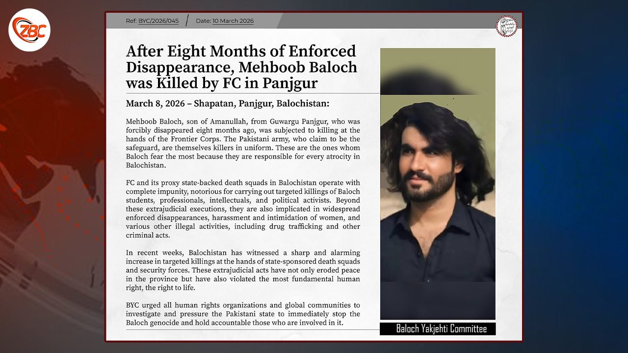 بی وائی سی ءَ گوں درسیں انسانی ھکانی گل ءُ میان استمانی تک ءَ لوٹ کرتگ کہ آ اے ویلانی بابت ءَ پٹ ءُ پول بہ کن اَنت ءُ پاکستان ریاست ءَ زور بدے اَنت کہ بلوچستان ءَ بلوچ چکچینی زوت دارگ بہ بیت ءُ ایشی ھواریں مردم جست گرگ بہ بنت۔