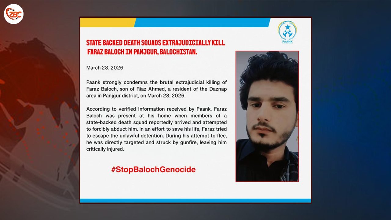 پانک ءِ گوشگ اِنت کہ 28 مارچ 2026 ءَ پراز بلوچ وتی گس ءَ بوتگ کہ ریاست ءِ چیردستی ءَ کارکنوکیں کشندہ ٹولی گس ءَ شتگ ءُ پہ زور آوار جنگ ءِ جھد کرتگ کہ آ پہ وتی جان ءِ پھریزگ ءَ جستگ، ھمے میان ءَ آیاں تیرگواری کرتگ ءُ تچک ءَ نشانگ کرتگ چہ ایشی آ سکا ٹپی بوتگ۔