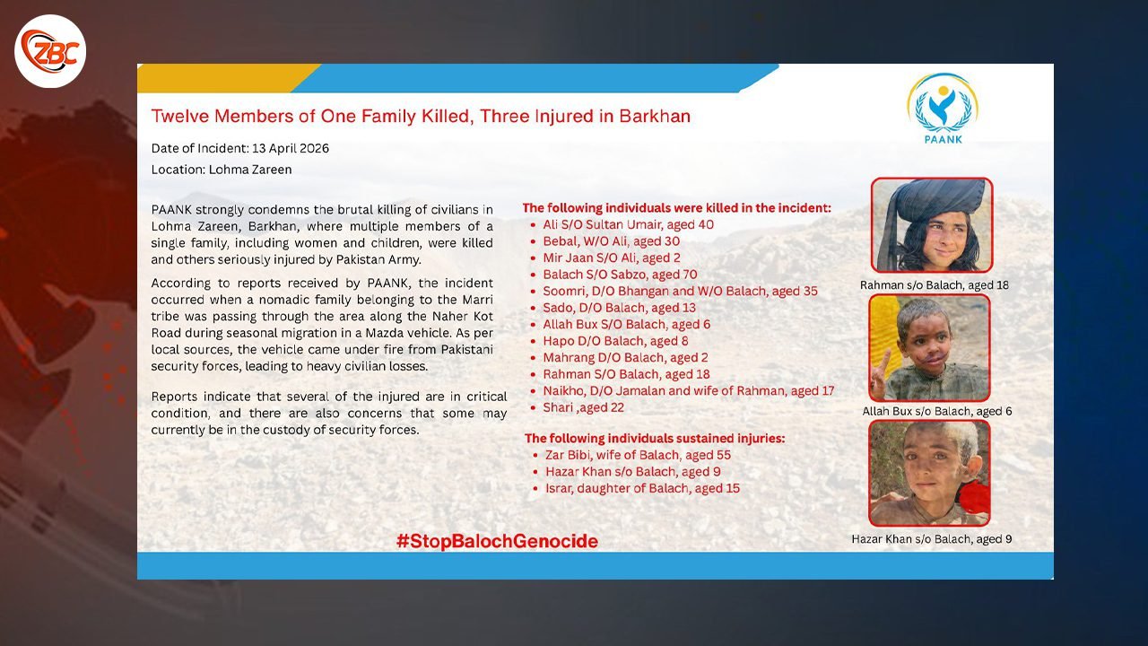 بلوچ نیشنل موومنٹ ءِ انسانی ھکانی ادارہ پانک ءَ وتی درشان ءَ بارکان ءِ ھند لھمہ زرین ءَ چہ پاکستانی پوج ءِ تیر گواری ءَ یکیں کھول ءِ دوازدہ مردم ءِ کوش ایر جتگ ءُ گوشتگ کہ بیران ءُ ٹپی بوتگیں مردمانی تہ ءَ زھگ ھم ھوار اِنت۔