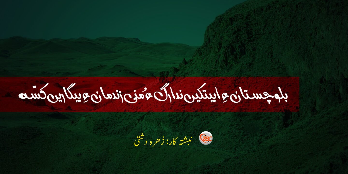 بلوچ ءَ مدام وتی وتن ءُ راج ءِ بابت ءَ جنگ کُتگ ءُ وتی گْراں نھادیں سر کُربان کُتگ اَنت ءُ ھما پُسگ کہ کوھاں کپتگ ءُ شُد ءُ تُن، بزگی، گرم ءِ جل ءُ برپیں زمستانی شپ اُوپار کنگ ءَ اَنت، آیانی درگت ءَ من ھِچ نبشتہ کُت نہ کن آں۔ آیانی کُربانی ءِ لبز گوں من ءَ نبشتہ کنگ وتی جاگہ اِنت، منی زِند آیانی بابت ءَ پہ جیڑگ ءَ گُڈی سیمسراں سر بہ بیت گنج اِنت۔ پمیشکا آیانی یک دمانے ءِ کُربانی گوں من ءَ گیشّینگ نہ بیت، چوناھیا زمین لس مھلوک ءَ وتی دوست بیت، بلے منی نِز ءَ بلوچستان وتی مٹّ ءُ درور وت اِنت۔ بلوچستان بھشت ءِ ٹُکّرے ھاوند ءَ مارا بکشاتگ، پمیشکا سرجمیں ھونوارانی چم آئی ءِ گنجانی، مال ءُ مڈیانی، آئی پراہ ءُ شاھگانیں پٹّ ءُ میداناں سک اَنت۔ ھردیں تو بلوچستان ءِ ندارگ ءَ در کپ ئے گُڑا ترا کازی ءِ گپّ یات کئیت کہ مئے بلوچستان کرزیت سد ھزار بچ ءُ جَنِک، گُڑا تو دل ءَ جیڑ ءِ واکی کازی ءَ راست گْوشتگ گْوادر ءِ زِرءِ چولانی ندارگ ترا ھر شھیدانی کِسّھاں گوں چولانی ھلوتاں گْوش اِیت ءُ سرپد کنت۔ گوربام ءَ دشت ءِ ھِژم گپتگیں پُلکانی بوہ ترا شھیدانی مانش ءِ بوہ ءَ سر کنت، کیچ ابیتکیں بیگاہ ترا لُمہ کریمہ ءُ شارُل ءِ دیمونیانی جیڑگ ءَ گوں دُچار گیج اَنت۔ یک جاھے بانُک کریمہ گْوش اِیت کہ من ءَ نمیرانیں کریم جان ءَ یک روچے کُلوہ ءِ دیم داتگ کِہ لُمہ تو کہ کراچی ءَ شُت ئے، گُڑا اورماڑہ ءَ گوں ھورتی ءَ بہ چار گُڑا تو زان ئے پہ بلوچستان ءَ انگت باز کنگی اِنت۔