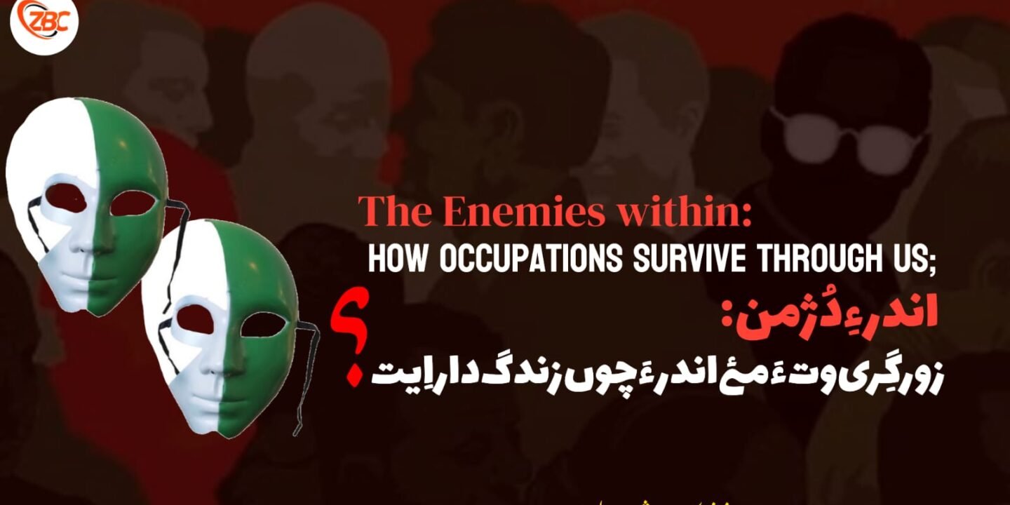 نوں گپ ایش اِنت کہ ھر ھما دژمن ءِ ￵پندل کہ مئے اندر ءَ ￴ھست اَنت مارا آ سرجم ءَ ￴ولگوج کنگی اَنت، مارا اے اندیمیں اَمَل سرپد بوَگی اَنت کہ آ کُجام مئے ردیاں کہ دژمن مئے اندر ءَ ￴چِہ ولگوج بوگ ءَ ￴نہ اِنت؟ مارا چہ وتی بے سمائی اَمَلاں پھریزگ لوٹ اِیت کہ چرائی ءَ ￴ما نُکس ورگ ءَ اِیں؟ بُرز ءِ ￵دُرستیں زورگر ءِ ￵چھرگ اِنت کہ دژمن ھمے شوربندیاں کارمرز کنت ءُ ￶مئے اندر ءَ ￴جاہ کنت، ما پد ءَ نازانتی وتی رازاں دُژمن ءِ ￵گْور ءَ شِنگ کن اِیں یا کہ پہ نازانتی زورگِر ءِ ￵مردماں کُمک کن اِیں ءُ ￶دیم ءَ ￴کاریں، بلے ھما کہ تچک ءُ راستیں مَردماں یا کہ بلوچ ءِ گْواچِنیں توار اَنت ما آیاں دیم￷ ءَ ￵آرگ ءِ ￵بدل ءَ آیاں ایرجن اِیں، گُڑا ما ھمد ءَ ￴چہ نِزور بہ اِیں ءُ ￶زورگِر ءَ ￴پہ نازانتی کُمک کن اِیں۔ اگاں اے ردیاں ما وتی پوہ بہ بہ اِیں ءُ ￶بہ زان اِیں گُڑا زورگِر ءِ زورگِری مئے اندر ءَ ￴زوت مِر اِیت ءُ ￶ پہ مُجّتی ھتم بیت۔ پرچا کہ سیلف ڈائریکٹ وار ءِ ￵تہ ءَ ھم ھمے نبشتہ اِنت کہ ”تو جنگ ءَ ￴ھما وھد ءَ ￴باج برے ، دانکہ تو وتا ءُ ￶ وتی دژمن ءَ ￴شَریں وڑ ءَ ￴بہ زان ئے۔ اگاں تو وتی اندر ءِ ￵نِزوری نہ زانتاں ءُ ￶ دُژمن ءِ ￵چالاکی، گُڑا تو جنگ ءَ ￴بے سوب بہ ئے ءُ ￶دژمن ترا پہ مُدامی ایردست کنت۔ تو ایردستی ءِ ￵سانکلاں بھ دراَتک نہ کن ئے۔“