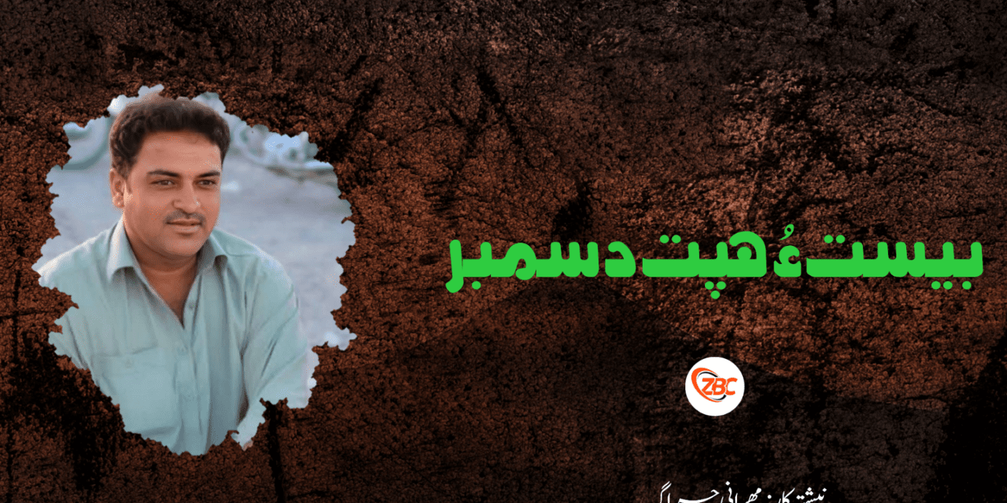 بیست ھپت دسمبر دو ھزار بیست ءُ چار ھمے روچ اِنت کہ گْوشے پمّن اے دُنیا چہ مھشر ءَ کمتر نہ اَت، اے ھمے روچ اِنت کہ شپ ءَ ترا لگوریں دُژمن ءَ چو دُزّیں روباہ ءَ چہ جند ءِ گِس ءَ بیگواہ کُت ءُ گوں وت بارت ءُ وتی ٹارچر سیل ءَ بند کنت، سرجمیں شپ ترا ھمے ٹارچر سیل ءَ لٹ ءُ کُٹ، زھرناکیں سوچن تئی بدن ءَ جت ءُ سھب ءِ بام بوَگ ساری تئی ٹارچر کُرتگیں جون ءَ کاریت ءُ پیشگاہ ءِ پُشتی نیمگ ءَ دور دنت۔