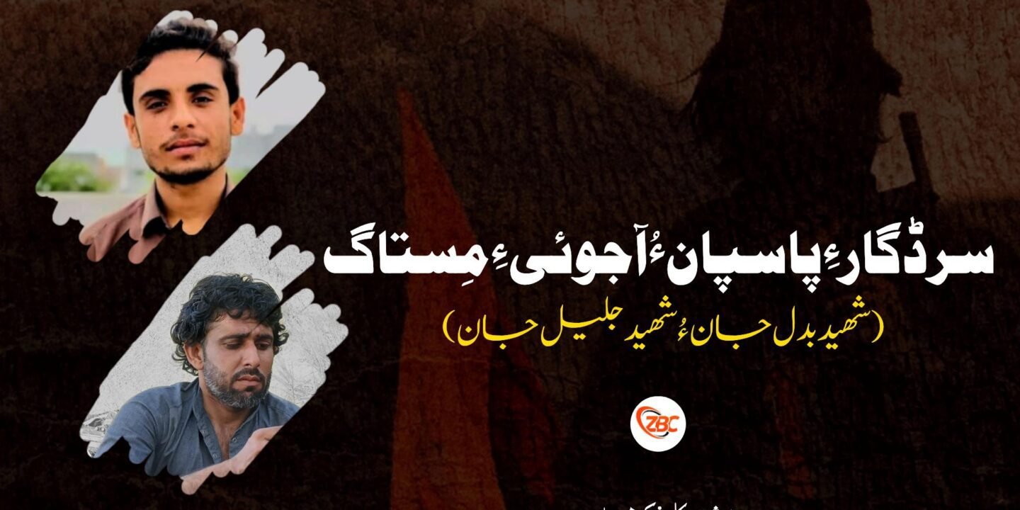 سُھرچکیں دْروت پہ شُما سرڈگار ءِ پاسپان ءُ آجوئی ءِ مِستاگ شھید بدل جان ءُ شھید جلیل جان شُما وتی سر پہ اے سرڈگار ءِ رکینگ ءَ کُربان کُت اَنت، وتی زند ءِ دْراھیں واھگ ءُ واھِشت کَل کُتاں ءُ لوگ یل کُت ءُ کوہ مُھکمیں سنگر کُتاں، بلے وتی ماتیں سرڈگار ماں لگوریں دُژمن ءَ را نہ بکشات ءُ بلوچ ءُ بلوچ راجدپتر اَچ شُمے داتگیں کُربانیاں ھِچبر شموشکار نہ بیت، شُما زندگ اِت، ھَمک سنگر ءَ، ھمک کِشک ءَ، ھمک سرمچار ءِ دل ءُ مجگانی تَہ ءَ، ھمک سرمچار ءِ بُر اِتگیں پند ءُ رِتکگیں ھونانی تہ ءَ، ھمک ماتانی نازینکانی تَہ ءَ، ھمک شپ ءِ پاسانی تَہ ءَ، ھمک شِپانک ءِ زھیروکانی تَہ ءَ، ھمک کوہ ءُ کوچکانی زیبائی ءِ انَدْر ءَ، ءُ ھمک سرمچار ءِ تْرندیں گامانی تَہ ءَ۔۔۔۔۔۔۔